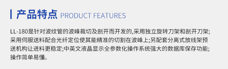 LL-180是針對波紋管的波峰裁切及剖開而開發(fā)的,采用獨立旋刀架和剖開刀架;采用伺服送料配合光纖定位使其能精準(zhǔn)的切割在波峰上;另配套分離式放線架,預(yù)送機(jī)構(gòu)讓進(jìn)料更穩(wěn)定;中英文液晶顯示,全參數(shù)化操作系統(tǒng),強(qiáng)大的數(shù)據(jù)庫保存功能;操作簡單易懂。